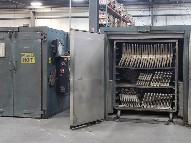 T51 heat treatment process bakes the casting at a low-temperature to artificial age it. The temperature range is between 440˚F (227°C). The casting is heated in the oven for 3-5 hours and then allowed to cool naturally. The low temperature stabilizes the shape of the castings and reduces stresses in the aluminum.